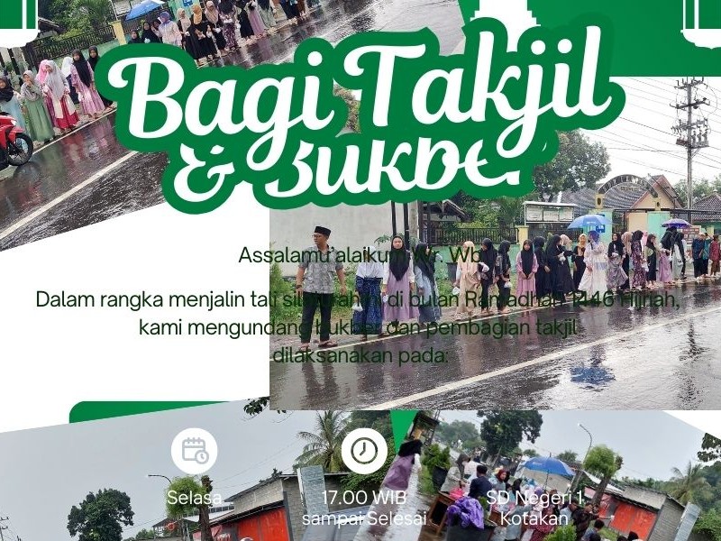 Pada hari selasa tanggal 18 Maret 2025 bertepatan 18 romdhan 1446 H, siswa tinggi mengadakan kegiatan bagi-bagi takjil di depan sekolah SD Negeri 1 Kotakan di lanjut sholat berjamaah dan bukber bersama dengan dewan guru. diadakan pertama kali di sekolah kami semoga kedepanya bisa melaksanakan kembali dan lebih bersosial dengan warga sekitaR.